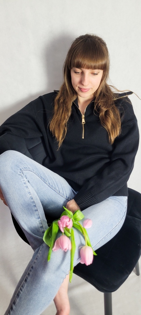 Miekki sweterek o luźnym kroju. Sweterek ma zapinany kołnierz, który można wywijać i układać w zależności od upodobań.