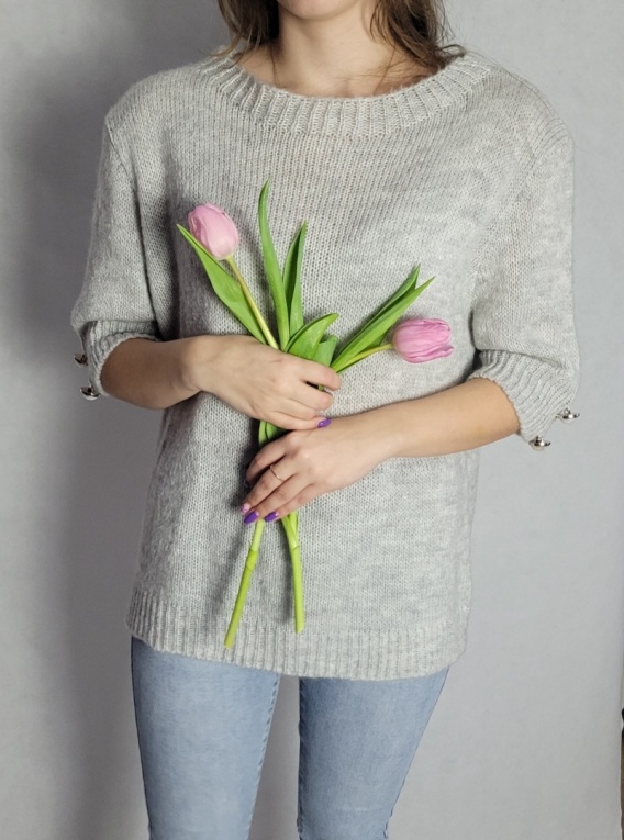 Moherowy Sweterek w kolorze szarym. Posiada ozdobne guziki na rękawach.
